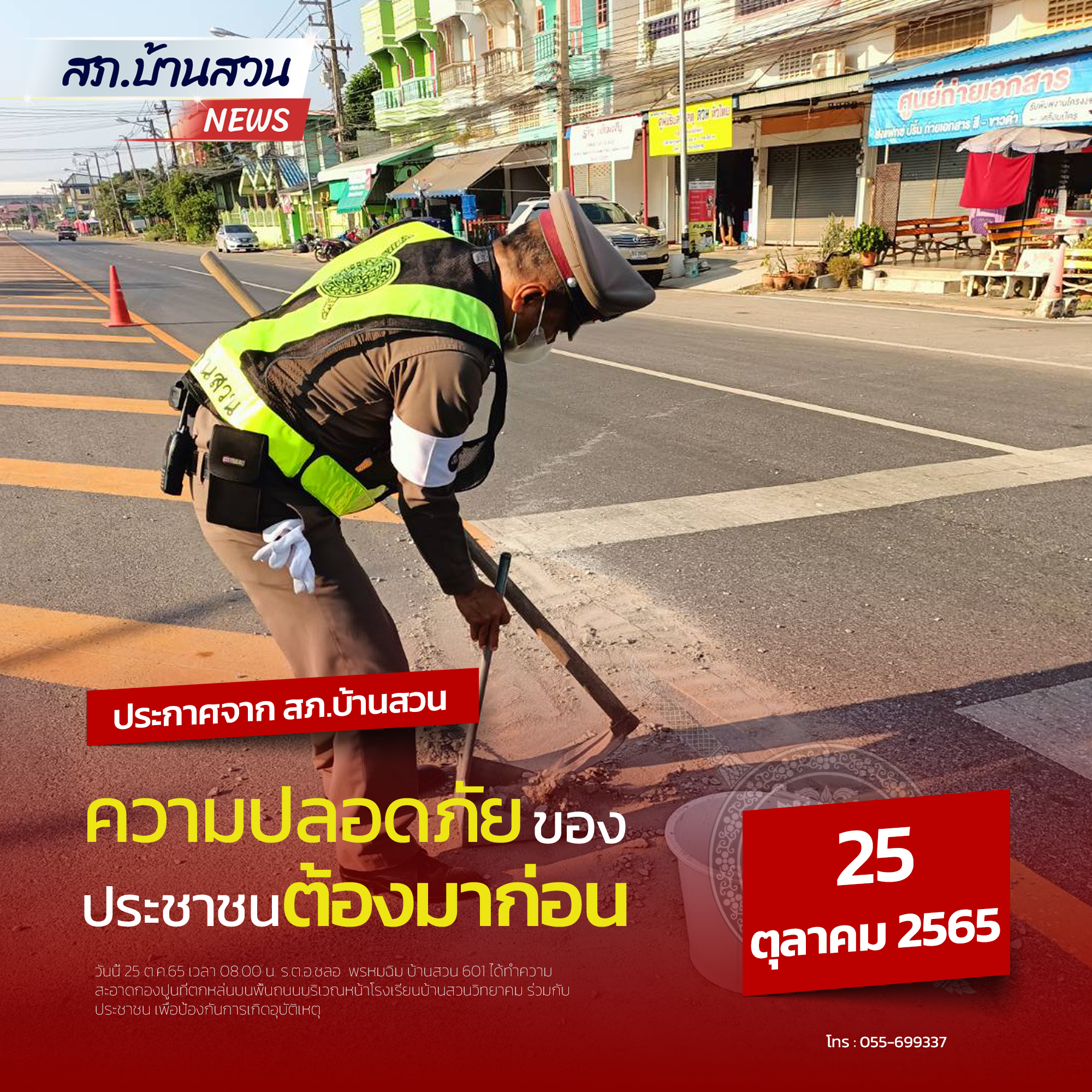 วันนี้ (25 ต.ค.65) เวลา 08.00 น. ร.ต.อ.ชลอ พรหมฉิม บ้านสวน 601 ได้ทำความสะอาดกองปูนที่ตกหล่นบนพื้นถน
