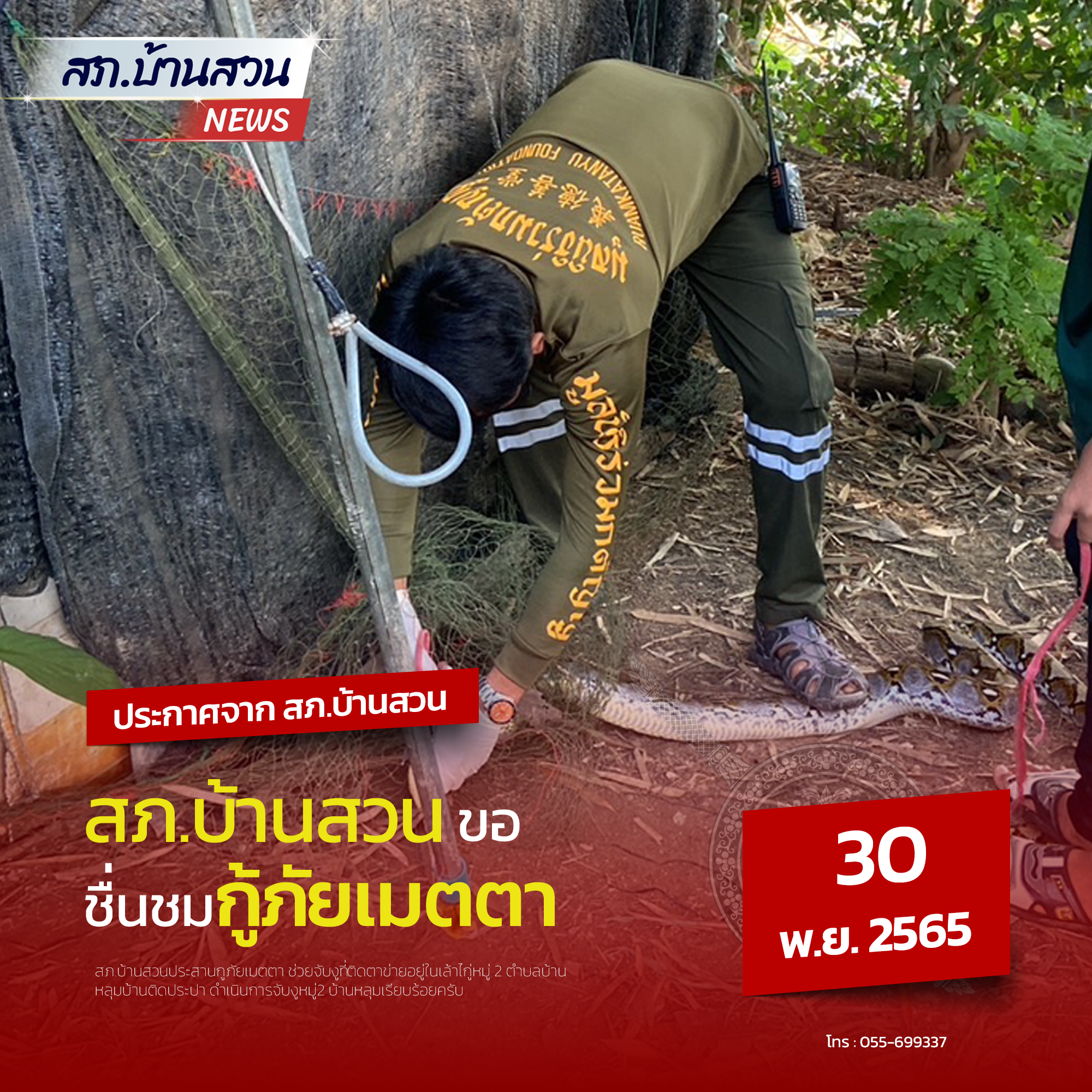 สภ.บ้านสวนประสานกู้ภัยเมตตา ช่วยจับงูที่ติดตาข่ายอยู่ในเล้าไกู่หมู่ 2 ตำบลบ้านหลุม ขณะนี้ดำเนินการจั